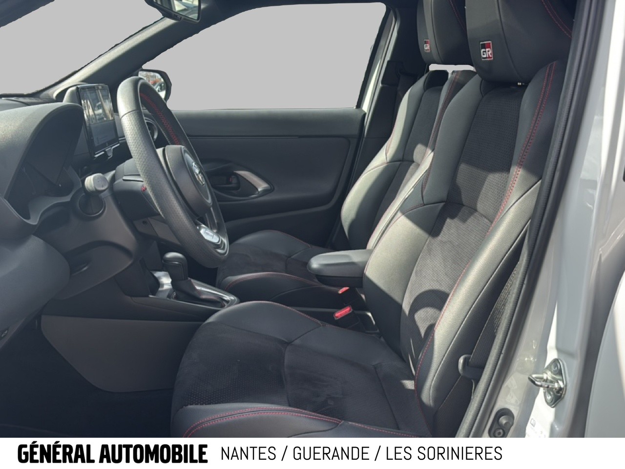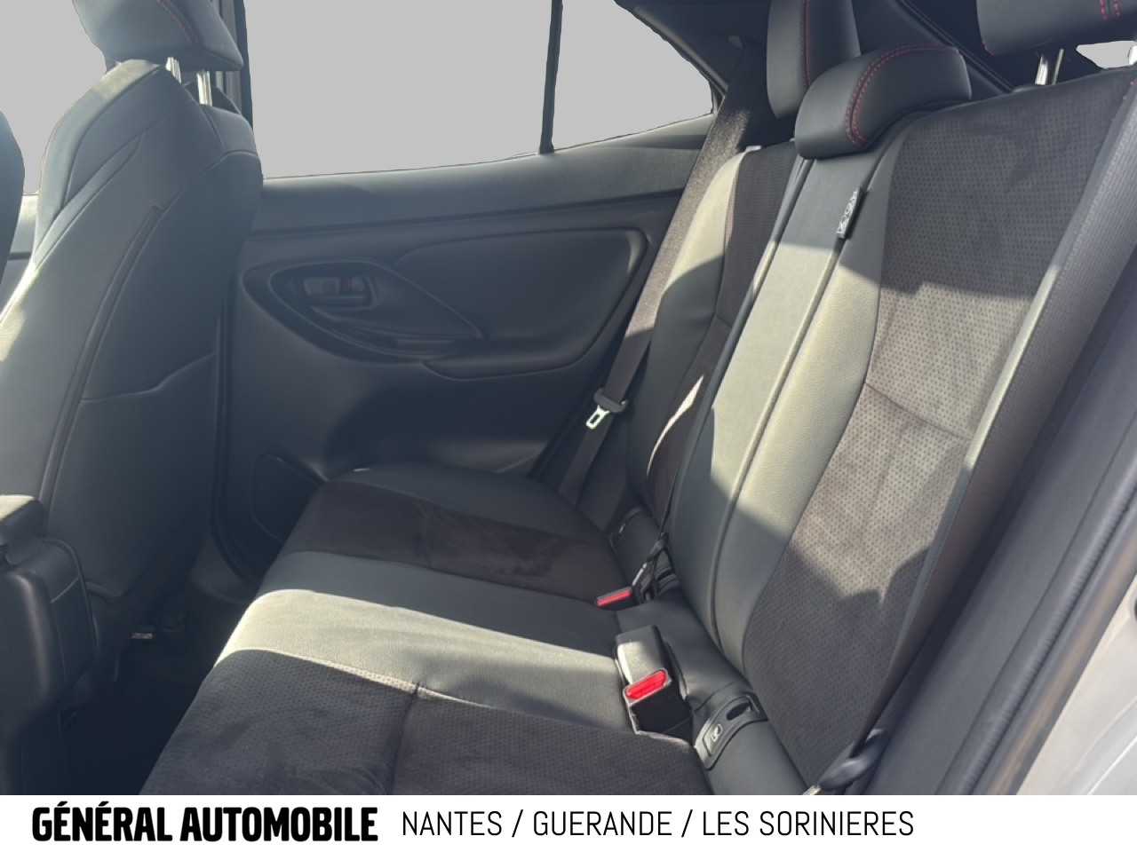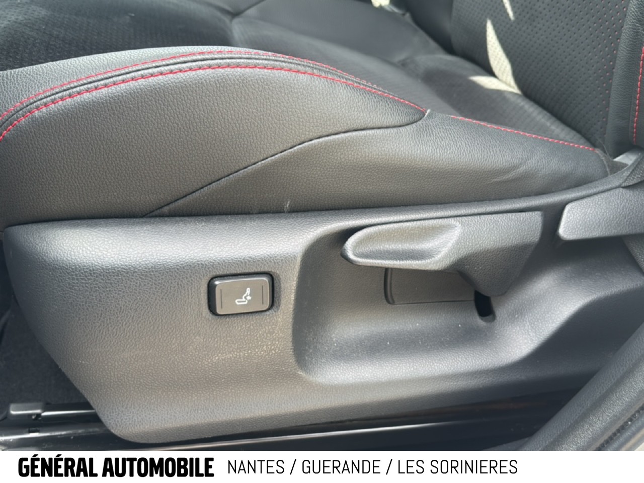 Sellerie Ultrasuede noir perforé rouge avec renforts latéraux en similicuir, surpiqûres rouges et logo